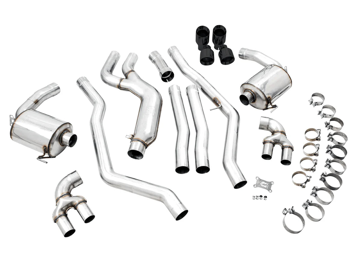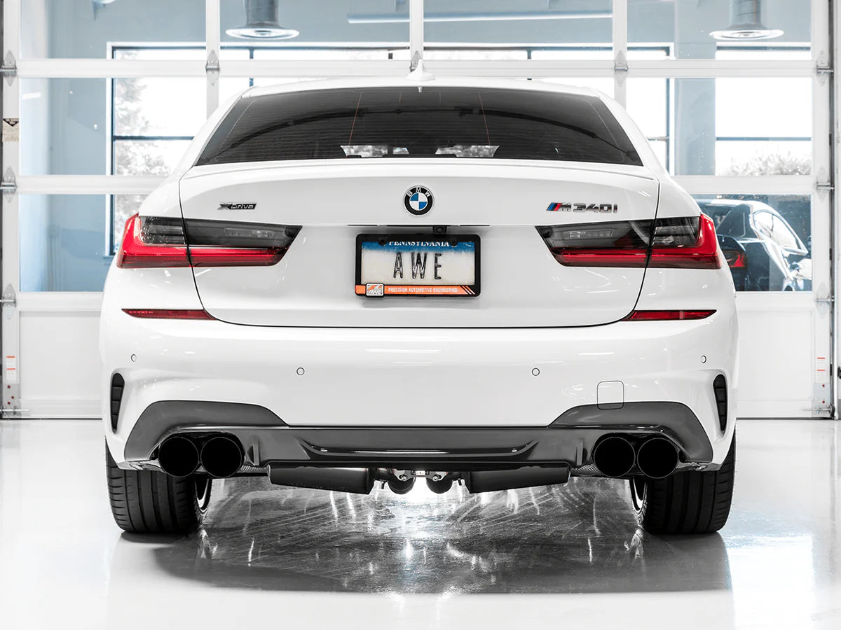 Presenting The Best Sounding Exhausts on the Planet for the BMW G20 M340i: At the intersection of sophistication and aggression lies the Touring Edition Exhaust. A dual 3” T304L stainless steel downpipe-back configuration, the AWE Touring Edition Exhaust is the perfect dose of steel for drivers looking for straight-pipe performance while not sacrificing daily drivability: a deep, sophisticated exhaust note with zero drone at highway speeds. Featuring a stamped stainless steel merge upstream equivalent to dual 3” tubing coming right off of the downpipe. Translation: an impressive 65% increase in flow over stock that future proofs for downpipes of various sizes. Beyond the unique merge, the exhaust splits into dual 3” piping to allow optimal flow throughout the entire exhaust route. Bringing up the rear, the Touring Edition features AWE’s patented drone-canceling solution, 180 Technology, which targets and omits drone-prone frequencies. What’s this mean for you? You’ll be tuned into a pure, full-bodied B58 soundtrack unlike any other. Equipping a downpipe? Read this (seriously): The Touring Edition Exhaust is available as non-resonated or resonated. We recommend the non-resonated variant for vehicles equipped with the stock downpipe. If your M340i is equipped with an aftermarket downpipe, we recommend going resonated. Have the stock downpipe but plan to go aftermarket later? No worries, you can swap in the resonated midsections with ease via an AWE Resonator Conversion Kit. Hit us here if you're in need of this Conversion Kit.Track Edition ExhaustTip Options: The Touring and Track Edition Exhausts feature statement-making quad 102mm, double-walled, slash-cut tips in either chrome silver or diamond black, complete with a stamped AWE logo. For those who want to keep their OE tips in place, we have configurations that were designed specifically to do that. Just for you.