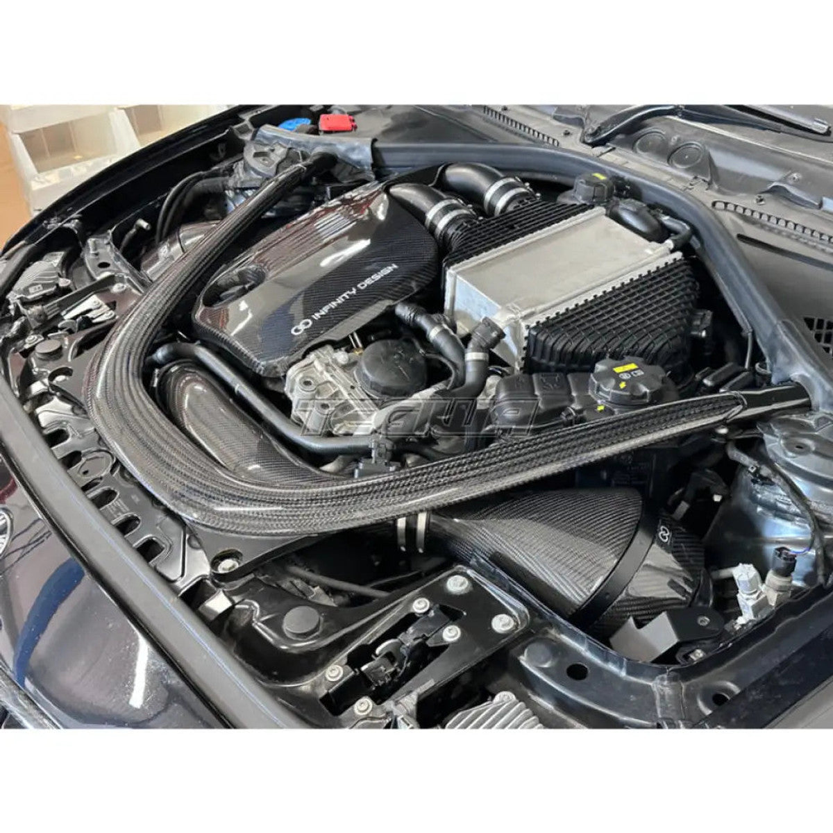 Upgrade your BMW F8X M3 M4 S55 engine bay with a sleek and lightweight carbon fiber engine cover.