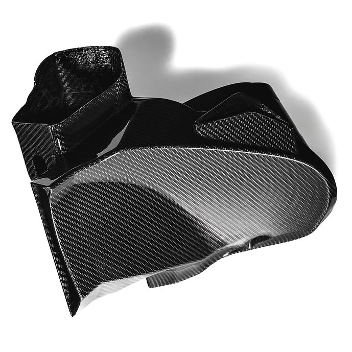The flared out turbo inlets are significantly larger than the stock units and are designed to smooth out and increase air speed into the turbo impellers. The turbo inlets are fed are by enlarged tapered intake tubes which take their air from our bespoke air filters which are housed in fully encapsulated air ducts / filter housings. We have spent a significant amount of time designing our air ducts and optimising them beyond the norm by having three cold air feeds. The first feed comes from the frontal factory air inlet. The second is a frontal air feed which are located in a region where we tested only ambient air reaches. The third and final feeds are the most interesting. They take from the gap between the chassis and wheel arch liners which face directly downwards.