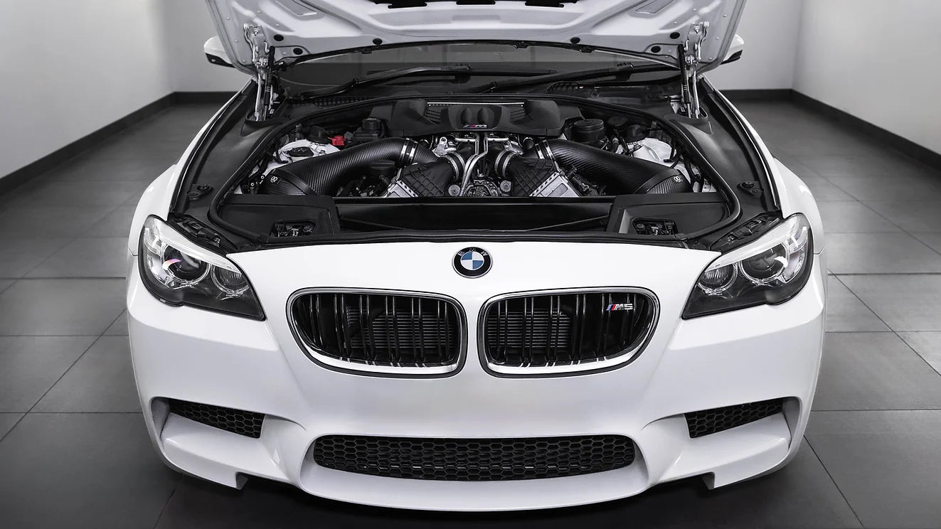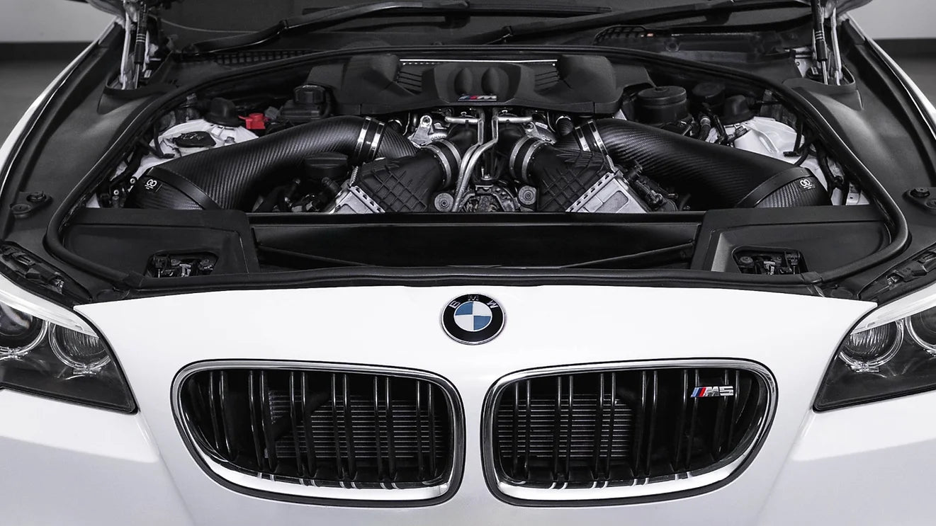 The inlet tube is attached via a stainless-steel v band clamp to the air filter housing which attaches directly to the OEM front air feed and has a 100mm opening facing towards the front corners of the engine bay rather than facing downwards towards the wheel arch liner away from engine heat.