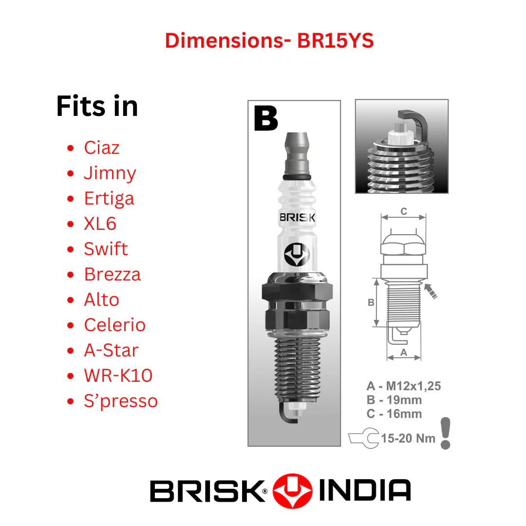 BRISK Silver Racing BR15YS silver electrode spark plugs are ideal solution for modern cars needing spark plug upgrade or replacement. Customers looking for improved engine performance owing to increased spark from Silver spark plugs can find an increase in car's performance, pick up and cold starts instantly.
