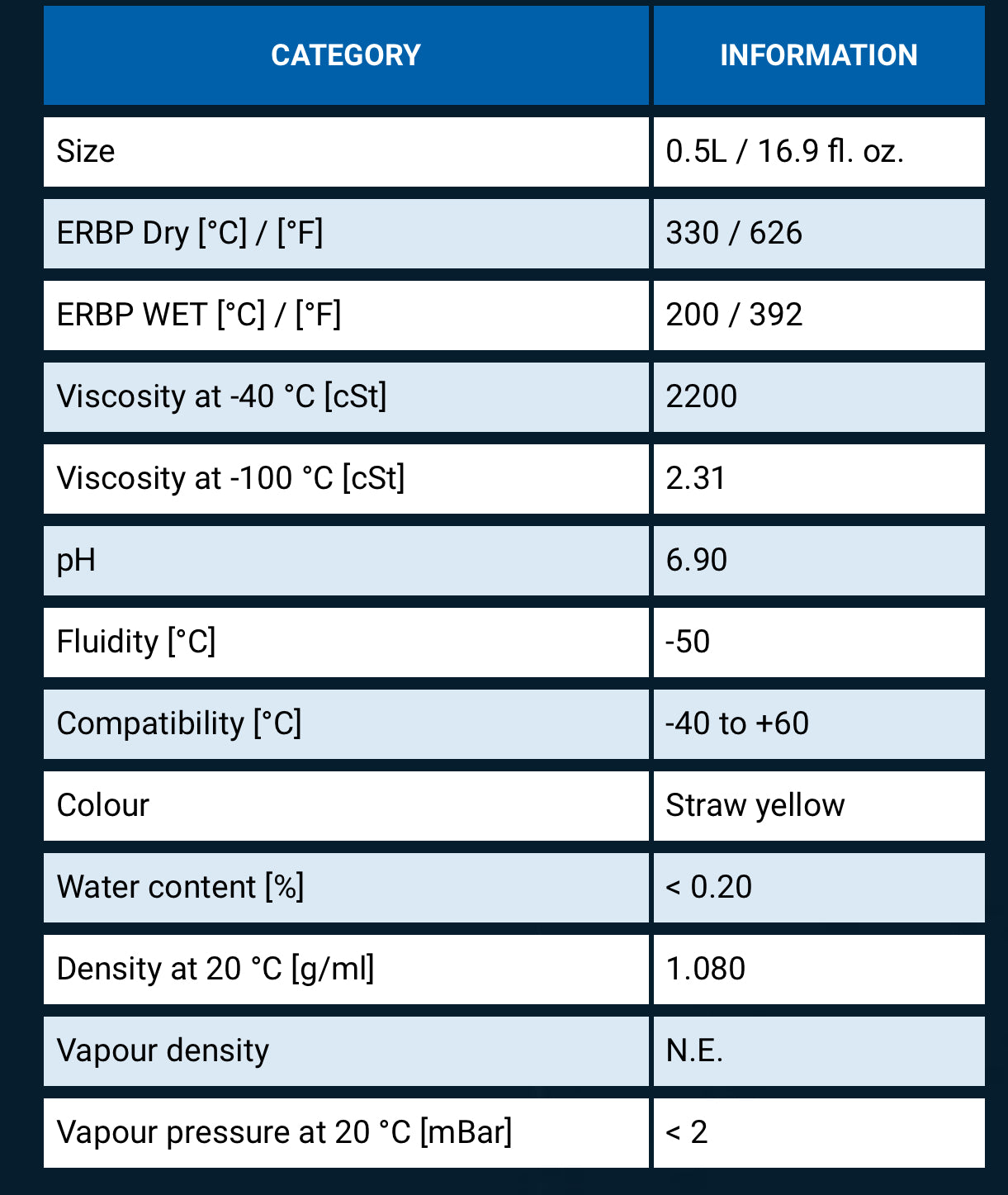 The typical dry boiling point of 330°C (626°F) is extremely high and guarantees maximum safety against vapor lock.