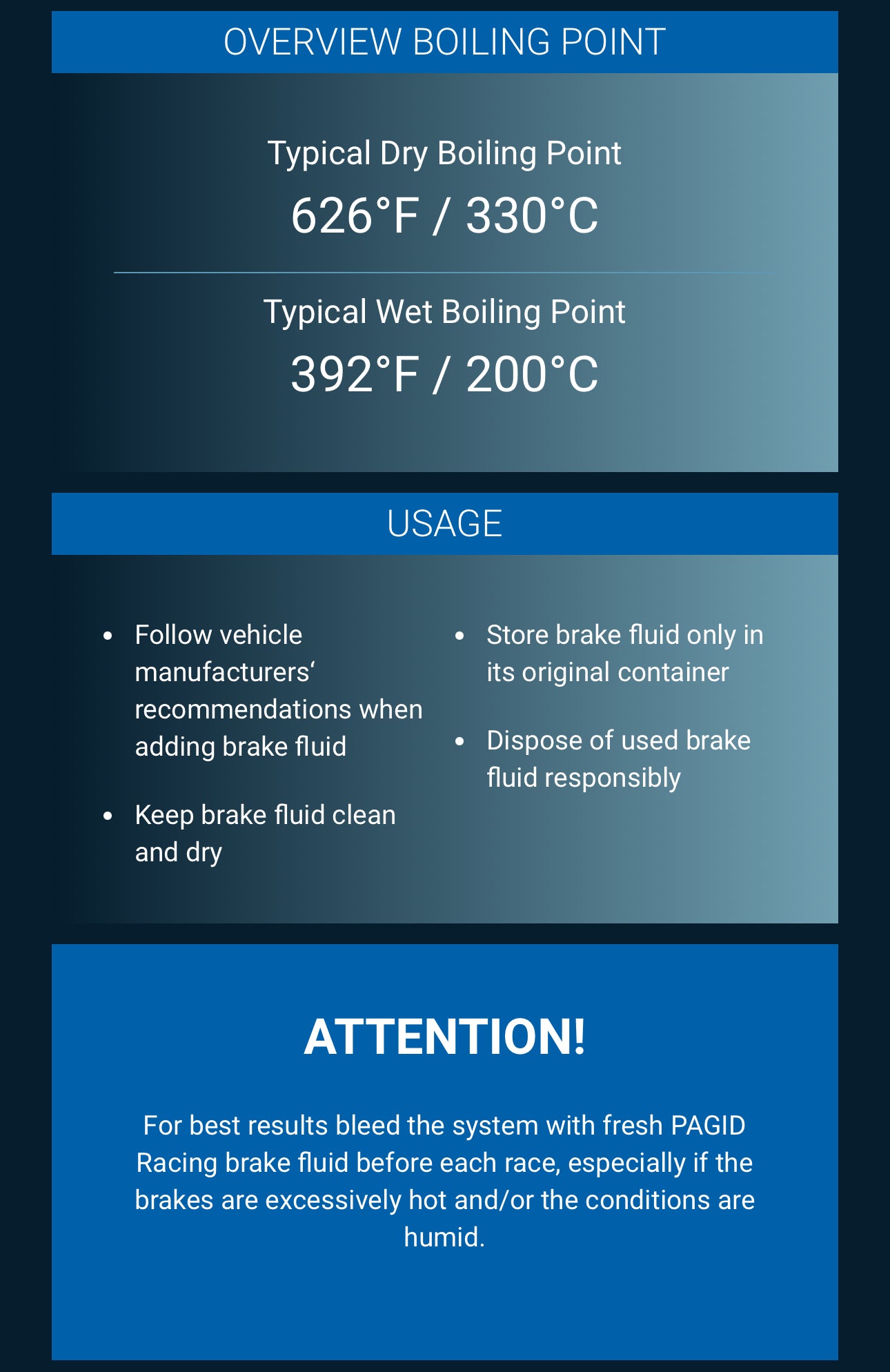 One of the biggest challenges developing a brake fluid is to reach a boiling point as high as possible. PAGID Racing Brake Fluid has been specially formulated for racing applications, where brake systems consistently operate at very high temperatures.