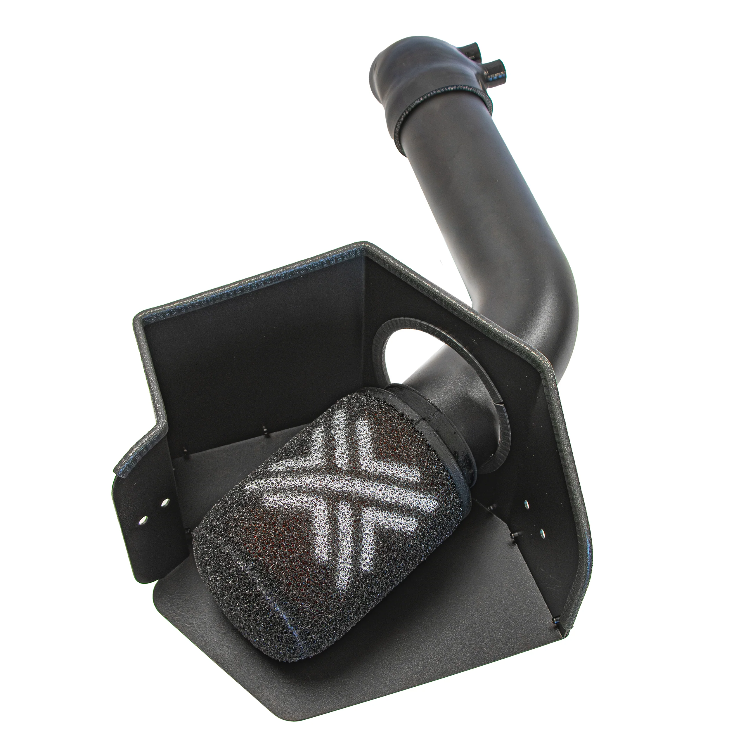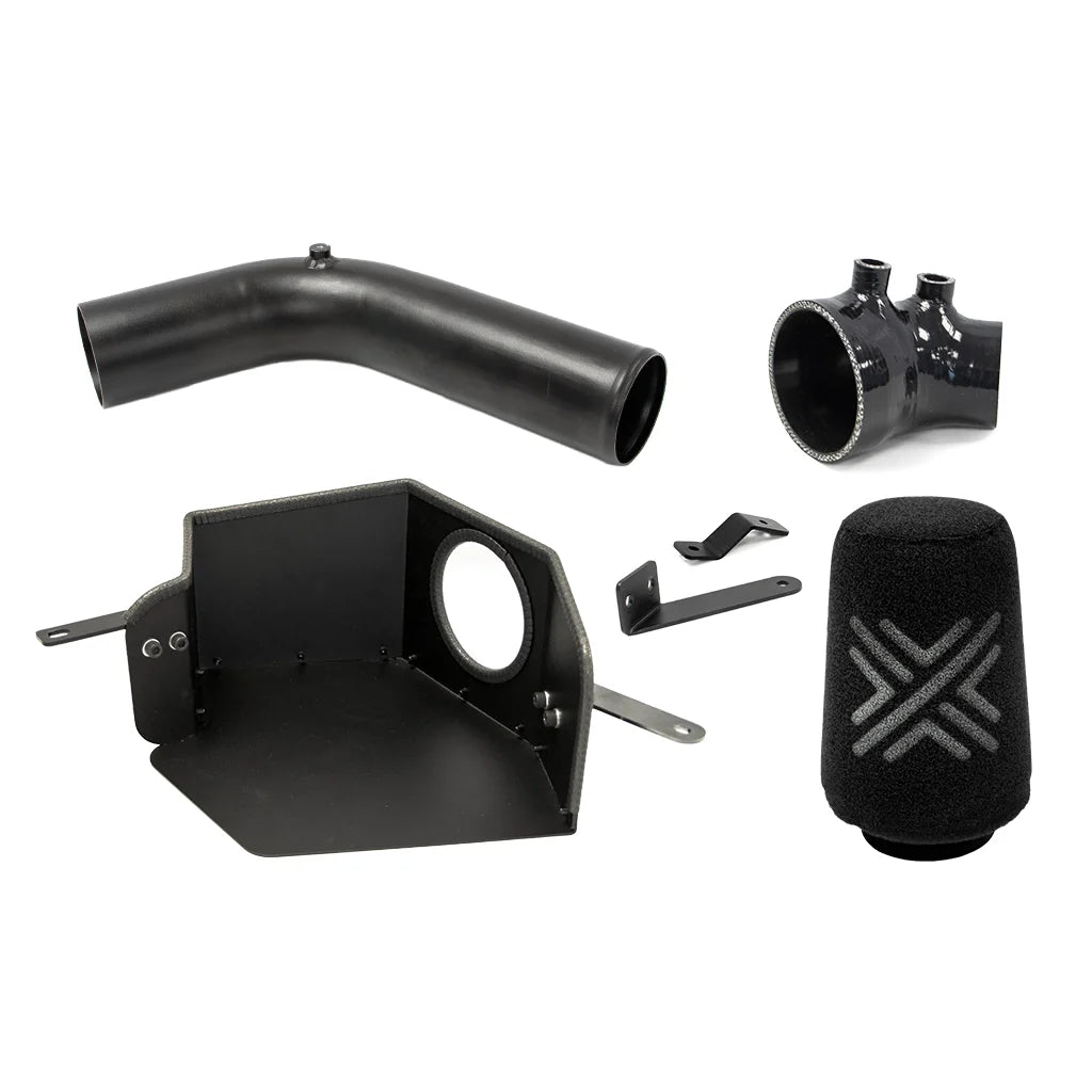 The Intake System comprises of a cylindrical Pipercross three-layer foam air filter, an aluminium heat shield, an aluminium intake hard pipe and a five-ply silicone throttle hose.