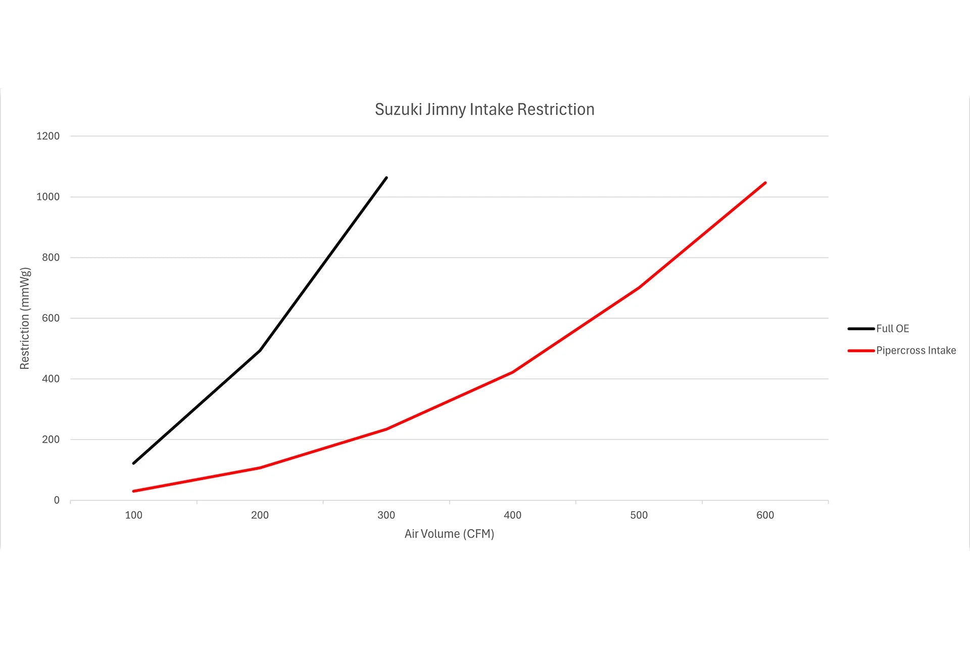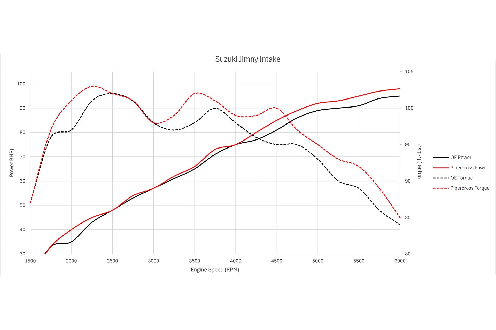 The kit was designed and developed from start to finish using one of our own Jimnys, which was subsequently tested on a dyno to prove the horsepower and torque gains achieved as a result of installing the Pipercross Air Intake.