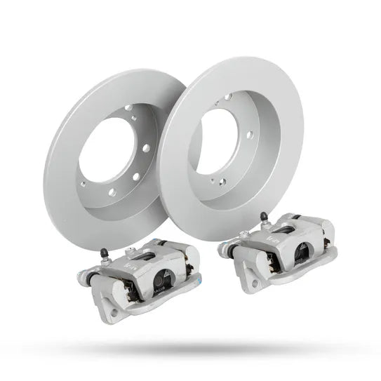 This upgrade kit includes a single-piston brake caliper setup, brake rotors with protective Geomet coating, stainless steel braided brake hoses, and high-performance Kevlar ceramic brake pads. Together, these components work seamlessly to deliver consistent, fade-resistant braking performance, outperforming standard factory drum brake systems.