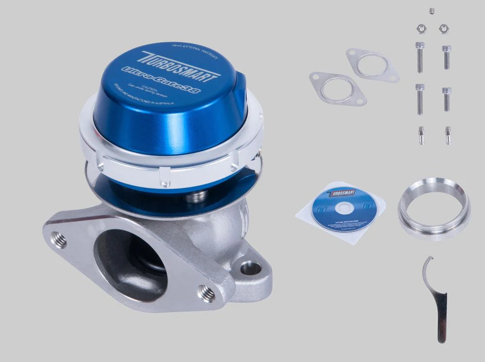 The new Ultra-Gate38 is a 38mm external wastegate for street and racing applications. Designed with minimum size and maximum flow in mind, the new Ultra-Gate38 is smaller and lighter than the previous model and features Turbosmart’s unique locking collar design for quicker spring changes and a one piece, stainless steel valve. Designed for 1.5" tubing.